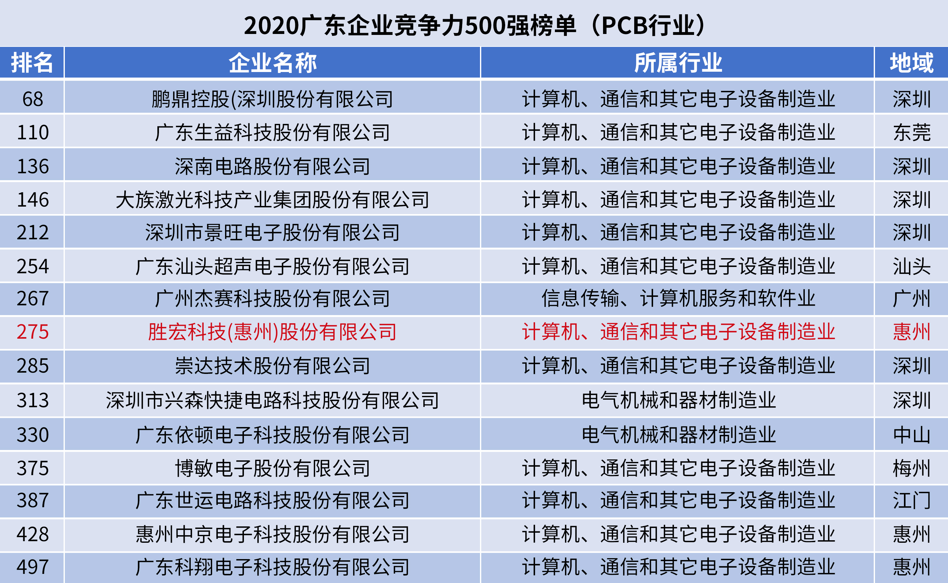 从发布的《2020广东企业竞争力500强分析报告》来看,入围的500强基本涵盖三大产业,包括计算机通信、房地产、金融、医药、汽车制造等41个细分行业。其中PCB行业有多宝电竞科技、鹏鼎控股、生益科技、深南电路、景旺电子、崇达技术、博敏电子等15家企业上榜。2020年 “广东竞争力500强”排名多宝电竞科技位列第275位,较2019年提升47位。